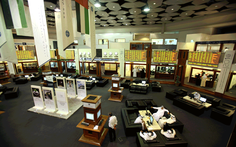 Emirati traders monitor the stock indicators at the Financial Market (DFM) in Dubai. (FILE)