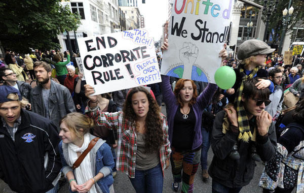 Demonstrators supporting the Occupy Wall Street movement against corporate power protest in Portland, Ore. Demonstrators marched downtown Thursday afternoon, disrupting traffic and businesses (AP)