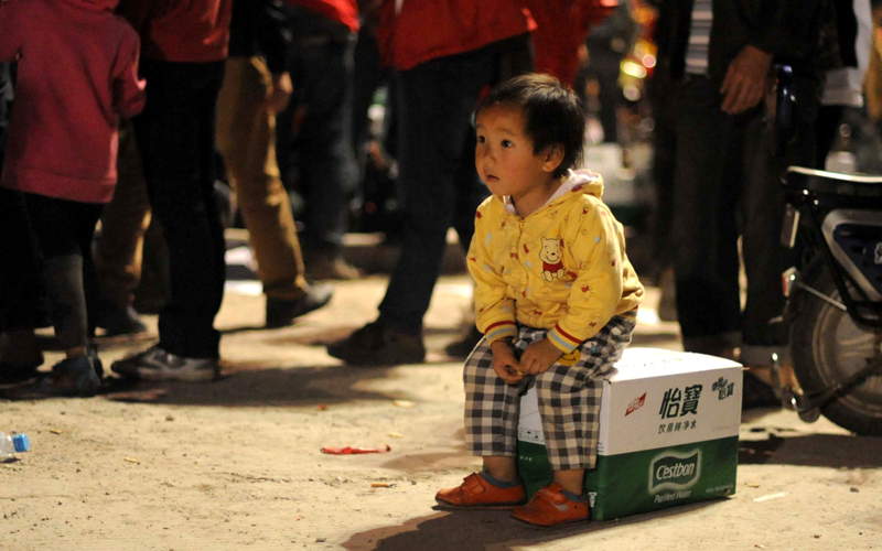 This photo taken on April 21, 2013 shows a little girl sitting on a box of mineral water while others queue up to get supplies at a temporary settlement in the disaster-hit area in Ya'an, southwest China's Sichuan province. Clogged roads, debris and landslides impeded rescuers on April 22 as they battled to find survivors of a powerful earthquake in mountainous southwest China that has left at least 188 dead. (AFP)