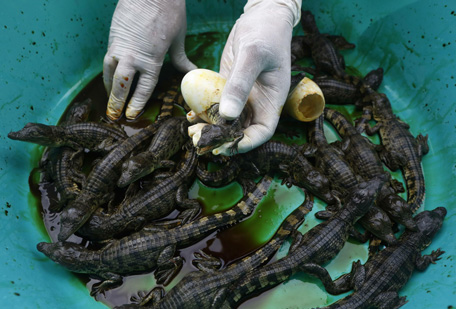 A caretaker shows a newly-hatched baby crocodile. (REUTERS)