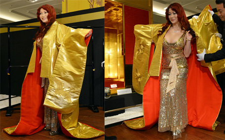 Japanese Mika Kano wears a bridal robe, woven by gold made fibers, priced at 52.5 million yen (560,000 USD) at the opening event of the "Gold Expo" exhibition at Tokyo's Matsuzakaya department store. (AFP)