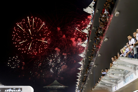 Fireworks explode after Red Bull Racing's Australian driver Mark Webber, Red Bull Racing's German driver Sebastian Vettel and Mercedes' German driver Nico Rosberg finished respectively in second, first and third place at the Yas Marina circuit in Abu Dhabi. (AFP)