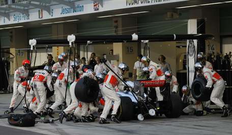 McLaren Formula One driver Jenson Button of Britain performs a pit stop during the Abu Dhabi F1 Grand Prix at the Yas Marina circuit on Yas Island. (REUTERS)