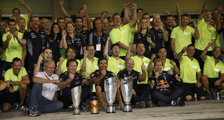Red Bull Formula One driver Sebastian Vettel of Germany (front R) and Red Bull Formula One driver Mark Webber of Australia (C) celebrate with the Red Bull team after the Abu Dhabi F1 Grand Prix at the Yas Marina circuit on Yas Island. (REUTERS)