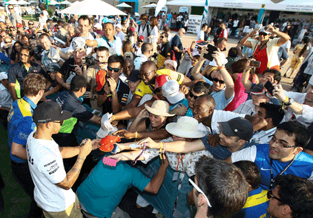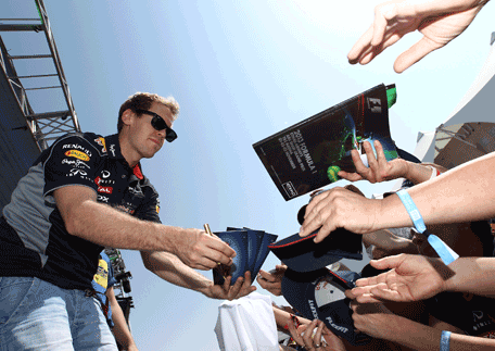 2013 F1 World Champion, Sebastien Vettel of Red Bull Racing, greets his legions of fans at Abu Dhabi’s Yas Marina Circuit