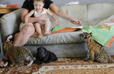 Yekaterina Khodakova holding her 18-month-old son Gleb watches two Siberian tiger cubs Plyusha and Clyopa and Shar Pei puppy Flaxy playing in her house in the Black Sea resort of Sochi. Yekaterina Khodakova's Shar Pei dog Cleopatra breastfeeds tiger cubs Plyusha and her sibling Clyopa. The cubs were born in late May in a small zoo at the Oktryabsky resport in Sochi, but their mother refused to feed them. Fewer than 400 Siberian tigers have survived in the wild, most of them in the cedar forests of Russia's Far East. (AP)
