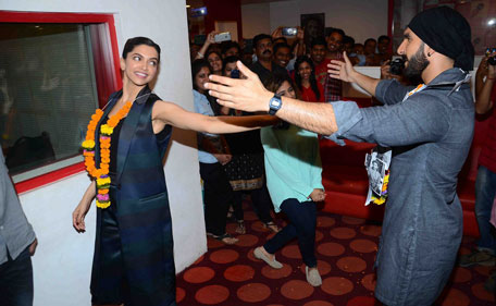 Bollywood actor Deepika Padukone and Ranveer Singh are seen here having a blast during a promotional event for their film 'Bajirao Mastani'.