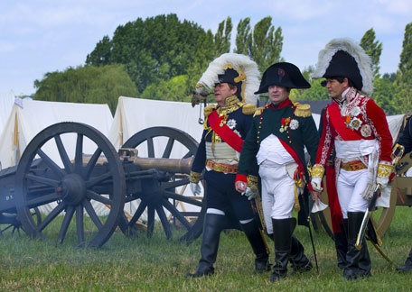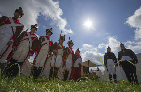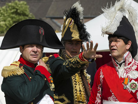 Performers take part in the re-enactment of the visit of French Emperor Napoleon in the French troops' bivouac as part of the bicentennial celebrations for the Battle of Waterloo, in Ligny, Belgium, June 13, 2015. (Reuters)