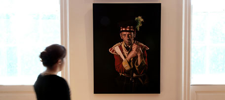 An unidentified person looks at photographic portraits by British photographer Sam Faulkner of people taking part in a re-enactment of the battle of Waterloo dressed in historically correct uniforms at a press preview in London, Thursday, June 11, 2015.(AP)