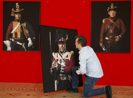 British photographer Sam Faulkner, poses with photographic portraits of people taking part in a re-enactment of the battle of Waterloo dressed in historically correct uniforms at a press preview in London, Thursday, June 11, 2015. (Reuters)