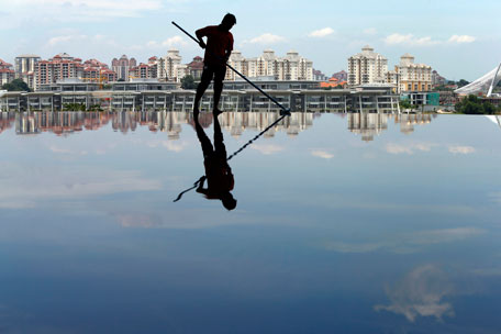A worker cleans up a pool inside the Tuanku Mizan Zainal Abidin mosque in Putrajaya. (REUTERS)