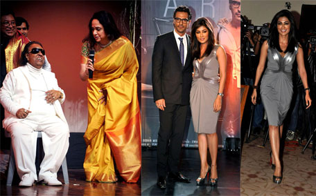 Chitrangada Singh (C) poses with actor Arjun Rampal (L) during the launch of the forthcoming Hindi film 'Inkaar' Calendar 2013 directed by Sudhir Mishra (R) in Mumbai. (AFP)