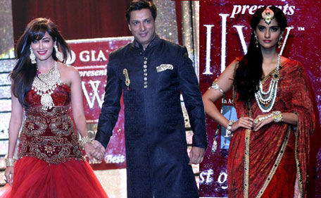 Indian Bollywood fraternity displays a creation during the India International Jewellery Week 2013 (IIJW) Grand Finale in Mumbai late August 8, 2013. (AFP)