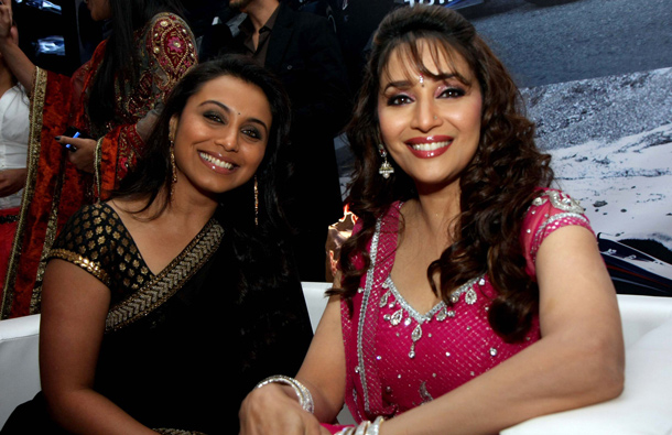 Indian Bollywood actresses Rani Mukherjee and Madhuri Dixit arrive to support Mumbai Police at their annual entertainment “Police show colors Umang 2012” . (AFP)