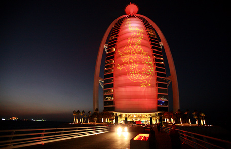 A dragon light design illuminates the surface of Burj Al Arab hotel, during Chinese new year clebrations in Dubai. (Ashok Verma)