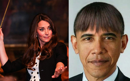 US President Barack Obama makes light of his wife's new bangs with a mock pictures of himself with the same hairdo in this humorous photo created by the White House shown at the annual White House Correspondents' Association dinner in Washington. REUTERS