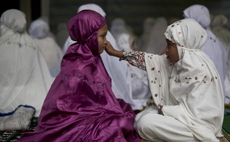 An Indonesian Muslim girl (R) living in Malaysia adjusts her friend's scarf before Eid al-Adha prayers in Kuala Lumpur on October 15, 2013. Eid al-Adha is celebrated throughout the Muslim world in remembrance of Abraham's readiness to sacrifice his son to God with cows and goats traditionally slaughtered on this holy day. (AFP)