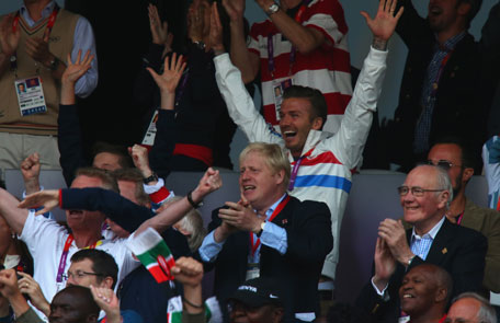 David Beckham and mayor of London Boris Johnson celebrate as Mohamed Farah of Great Britain wins gold in the Men's 5000m Final. (GETTY/GALLO)