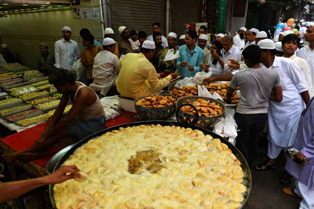 Indian Muslim men gather around a sweets shop as they buy sweets before offering prayers during Eid Al Fitrin the old quarters of New Delhi on July 18, 2015. Muslims around the world are celebrating the Eid Al Fitr festival, which marks the end of the fasting month of Ramadan. (AFP)