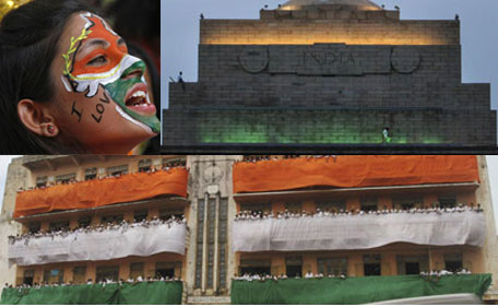 Indian policemen guard the India Gate monument, draped with colors of the Indian flag on the eve of Independence Day in New Delhi, India, Wednesday, Aug 14, 2013. India commemorates its Independence in 1947 from British colonial rule, on August 15. (AP)