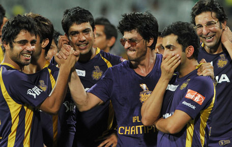 Kolkata Knight Riders owner and Bollywood actor Shah Rukh Khan (3rd R) celebrates with his teammates after they won the DLF IPL Twenty20 Champions Trophy in a final match against Chennai Super Kings at the M.A. Chidambaram Stadium in Chennai. (AFP)