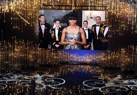 US First Lady Michelle Obama, on a video screen, announces the Oscar for Best Movie along with actor Jack Nicholson onstage at the 85th Annual Academy Awards. (AFP)