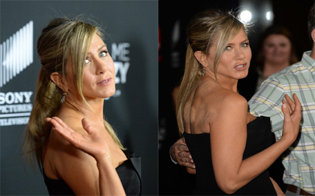 Jennifer Aniston showed round remnants of a recent cupping treatment as she arrived. (Photo by Getty Images)