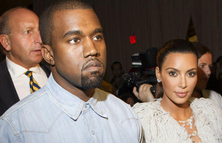 Kanye West, left, and Kim Kardashian attend the FIJI Water-sponsored Marchesa Spring 2013 Fashion Show. (AP)