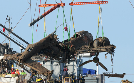 A World War II Dornier 17 aircraft is lifted from waters of the English Channel in Ramsgate, England. (Photo by Getty Images)
