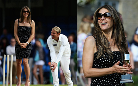 Elizabeth Hurley looks on during Shane Warne's Australia vs Michael Vaughan's England T20 match at Cirencester Cricket Club. (Photo by Getty Images)