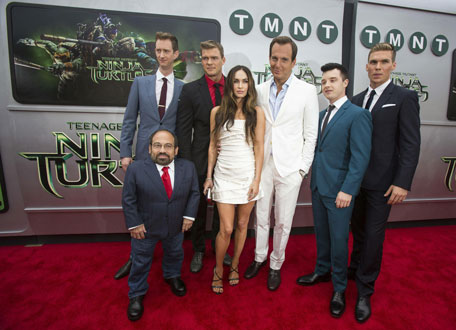 Cast members (from L-R) Danny Woodburn, Jeremy Howard, Alan Ritchson, Megan Fox, Will Arnett, Noel Fisher and Pete Ploszek pose at the premiere of "Teenage Mutant Ninja Turtles" in Los Angeles, California August 3, 2014. The movie opens in the US on August 8. (REUTERS)
