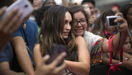 Cast member Megan Fox (L) poses with fans at the premiere of "Teenage Mutant Ninja Turtles" in Los Angeles, California August 3, 2014. The movie opens in the US on August 8. (REUTERS)