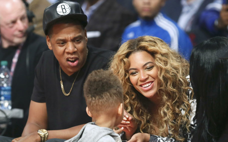 Beyonce (R) greets Alicia Key's son Egypt Daoud Deanas husband Jay-Z (L) looks on during the NBA All-Star basketball game in Houston, Texas. (REUTERS)
