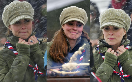 Kate, the Duchess of Cambridge, during her visit to Great Tower Scout camp, Newby Bridge, Cumbria, northern England Friday March 22 2013 where she braved the snow lighting fires and making bread twists with young people. The Duchess , a volunteer in the Scout Association, attended a volunteer training day. (AP)