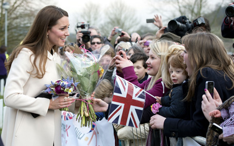 Catherine, Duchess of Cambridge, receive flowers during a visit with her husband Prince William, Duke of Cambridge (unseen), to the Child Bereavement, in Saunderton. (AFP)