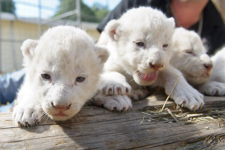 Lion mother Princess licks one of her white lion babies on July 17, 2012 in Kempten, southern Germany. Lion mother Princess gave birth to six white lion cubs on July 11, 2012 at the Circus Krone. (AFP)
