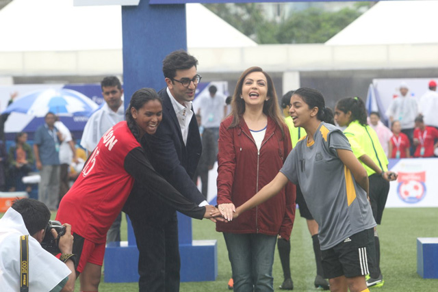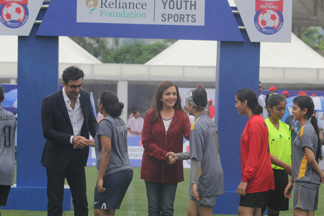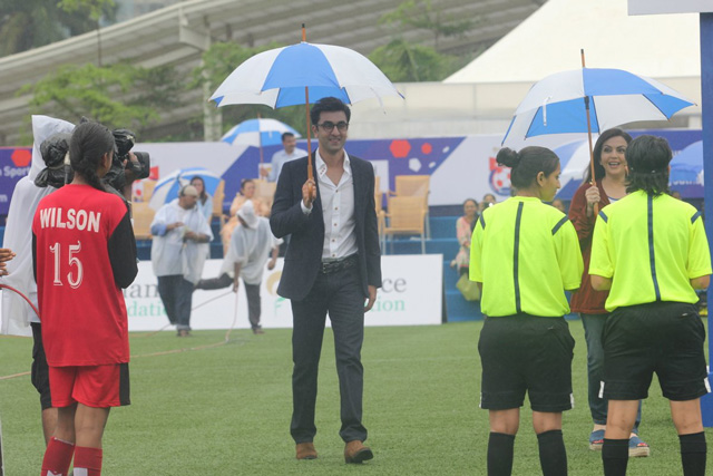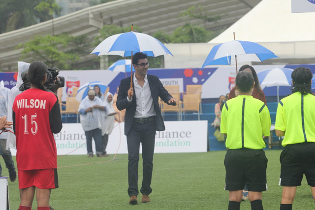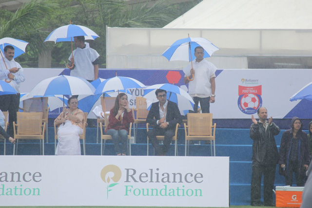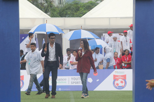 Bollywood actor Ranbir Kapoor braced the wet weather to come out and support Nita Ambani at the Jio Reliance Foundation Youth Sports Launch.