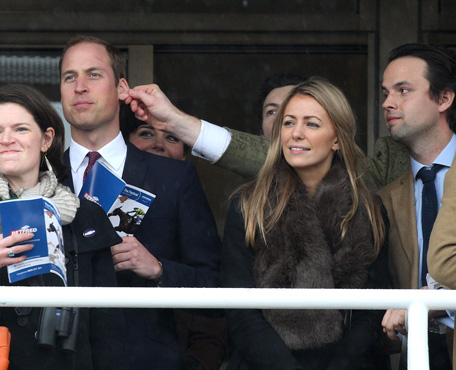 Prince William, Duke of Cambridge has his ear pulled by a friend as Catherine, Duchess of Cambridge looks on on day 4 of the Cheltenham Festival at Cheltenham Racecourse. (Getty Images)