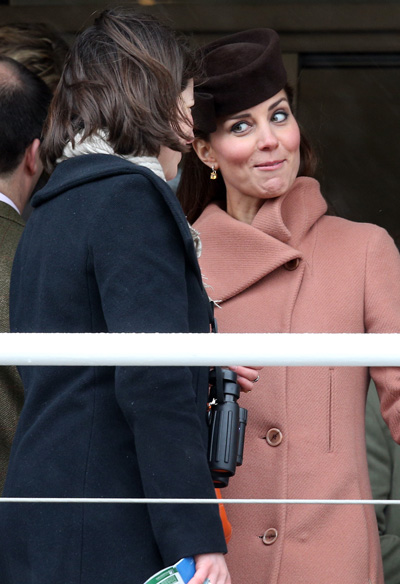 Catherine, Duchess of Cambridge speaks with a fellow racegoer as they watch the races on Gold Cup Day at Cheltenham Racecourse on the fourth and final day of the Cheltenham Festival 2013 in Cheltenham, England. Approximately 200,000 racing enthusiasts are expected at the four-day festival, which ends today and is seen as many as the highlight of the jump racing calendar. (Getty Images)