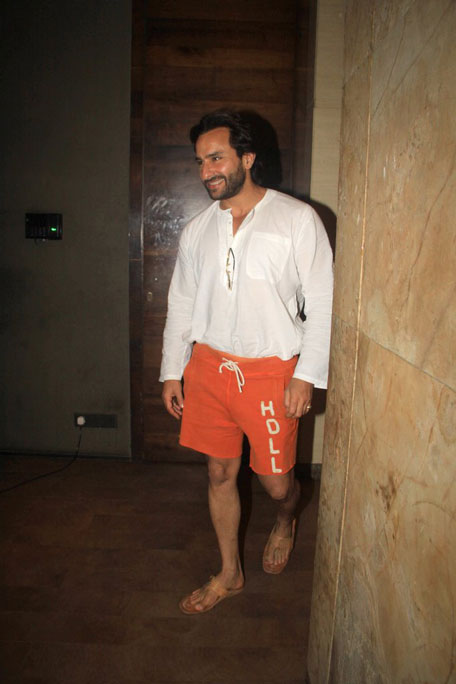 Sporting orange bermudas teamed with a white short kurta, Saif looked a far cry of his stylish self.