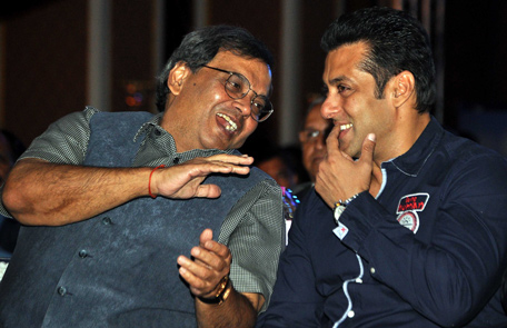 Indian Bollywood actor Salman Khan (R) gestures to Subhash Ghai as he takes part in a ‘IBN7 Super Idols Awards’ ceremony in Mumbai. (AFP)