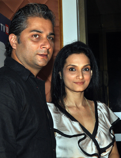 Indian Bollywood actress-singer and dancer Rajeshwari Sachdev (R) and her husband director Varun Badola pose as they arrive to attend a ‘IBN7 Super Idols Awards’ ceremony in Mumbai. (AFP)