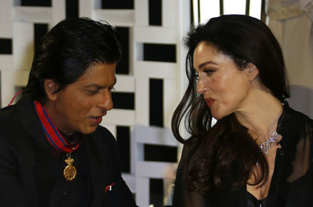 Shahrukh Khan (L) speaks with Italian actress Monica Bellucci (R) during the 12th Marrakech International Film Festival. (AFP)