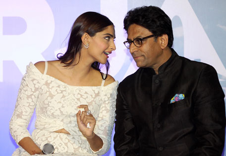 Indian Bollywood actress Sonam Kapoor (L) speaks with director Ram Madhvani during the launch of the trailer of the forthcoming biopic 'Neerja' in Mumbai late December 17, 2015. The film tells the story of stewardess Neerja Bhanot who was killed while protecting passengers on the hijacked aircraft Pan Am 73 in 1986. (AFP)