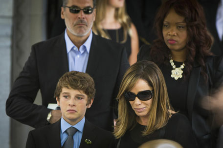 Melissa Rivers, the daughter of Joan Rivers, and her son Cooper depart the funeral of her mother, comedian Joan Rivers, at Temple Emanu-El in New York September 7, 2014. (REUTERS)