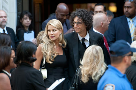 Howard Stern (center R) and wife Beth Ostrosky Stern attend the Joan Rivers memorial service at Temple Emanu-El on September 7, 2014 in New York City. Rivers passed away on September 4, 2014 after suffering respiratory and cardiac arrest during vocal cord surgery on August 28, 2014. (AFP)