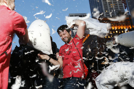 A participant swings his pillow during The Great San Francisco Valentine's Day Pillow Fight, in San Francisco, February 14, 2015. (Reuters)