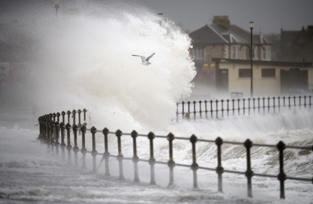 Waves break over Saltcoats Esplanade on January 3, 2014 in Saltcoats ,Scotland. Gail force winds and an expected tidal surge are set to cause wide spread flooding in coastal areas of Scotland. (Getty Images)