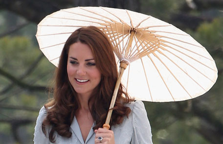 Prince William (R) with his wife Catherine (L), the Duchess of Cambridge, walk through the graveyard to attend a ceremony during their visit to the Kranji Memorial Cemetery in Singapore. (AFP)