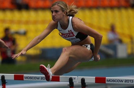 Canada's Brianne Theisen Eaton competes during the women's heptathlon 100 metres hurdles event at the 2013 IAAF World Championships at the Luzhniki stadium in Moscow on August 12, 2013. (AFP)